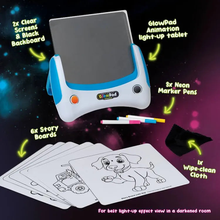 Contents: x1 GlowPad Animation light-up tablet, 2 clear screens, 1 black backboard, 6 storyboards, 3 neon marker pens, and 1 wipe-clean cloth.