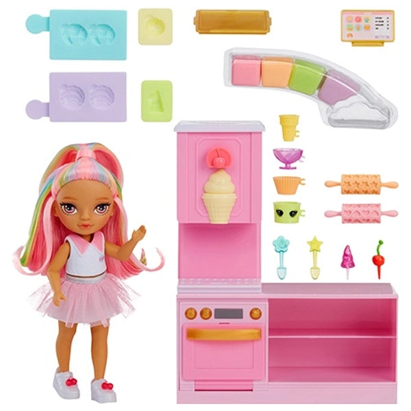 Contents: x1 Kandy doll, x4 coloured dough, x2 pastry mould sheets, x1 baking sheet, x2 rolling pins, x2 spoons, x1 sorbet cup, x1 cupcake cup, x1 cone, x1 ice cream cup, x1 horn, x1 cherry, x2 cookie cutters, x1 tablet