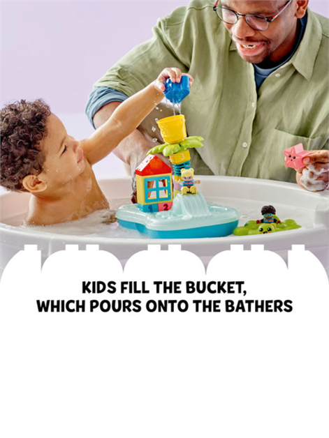 Fun toy to build in the tub – This bath-time toy comes with a floating island and turtle ring, flexible palm tree with a water bucket, octopus slide, 2 child figures, a starfish and rain-cloud pourers