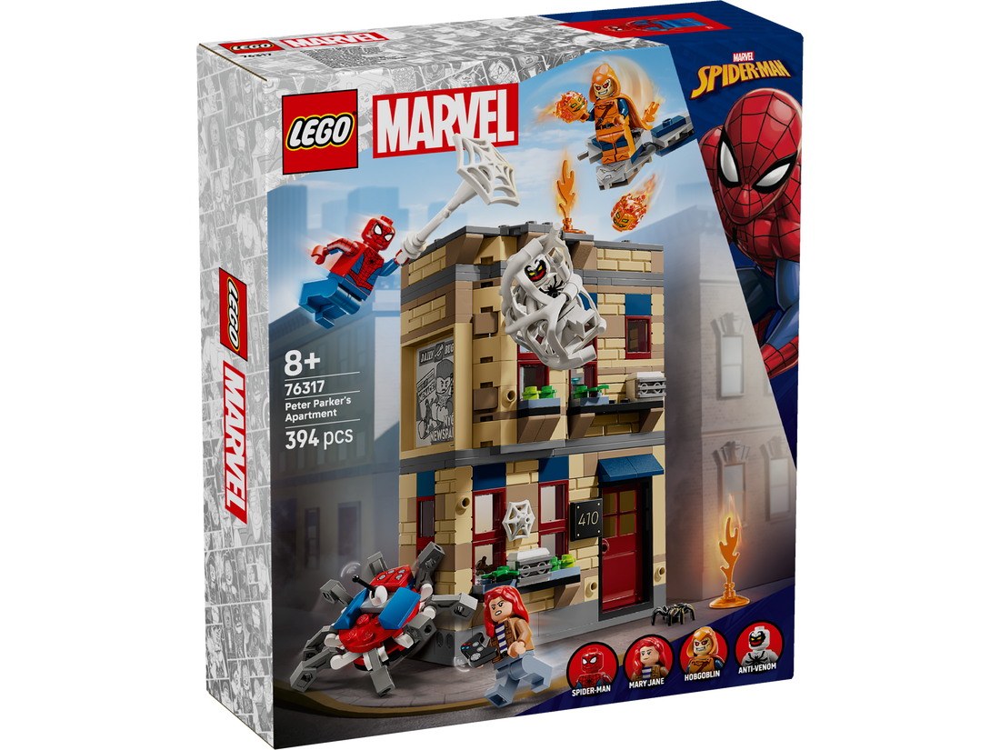Peter Parker’s Apartment (76317) is a high-quality LEGO® ǀ Marvel Spider-Man collectible for fans of buildable toys, Super Hero minifigures and explosive action. With endless play possibilities both inside and outside the apartment, this Super Hero building toy makes a great gift for kids aged 8 plus. The buildable set contains 4 minifigures: Hobgoblin on his glider with pumpkin bombs; Spider-Man and Anti-Venom blasting webs; and Mary Jane with a jointed spider robot. A giant, flexible web attached to the building can trap a minifigure. On the apartment’s ground floor is a kitchen. The first floor has a study and bedroom containing a flip-up bed, desk, computer, camera and a microscope. A push-button function makes part of the building collapse. Kids can connect this build-and-play set to Spider-Man vs. Oscorp (76324) and stack it on top of Spider-Verse: Miles Morales vs. The Spot (76311) for an even bigger play experience. Contains 394 pieces.